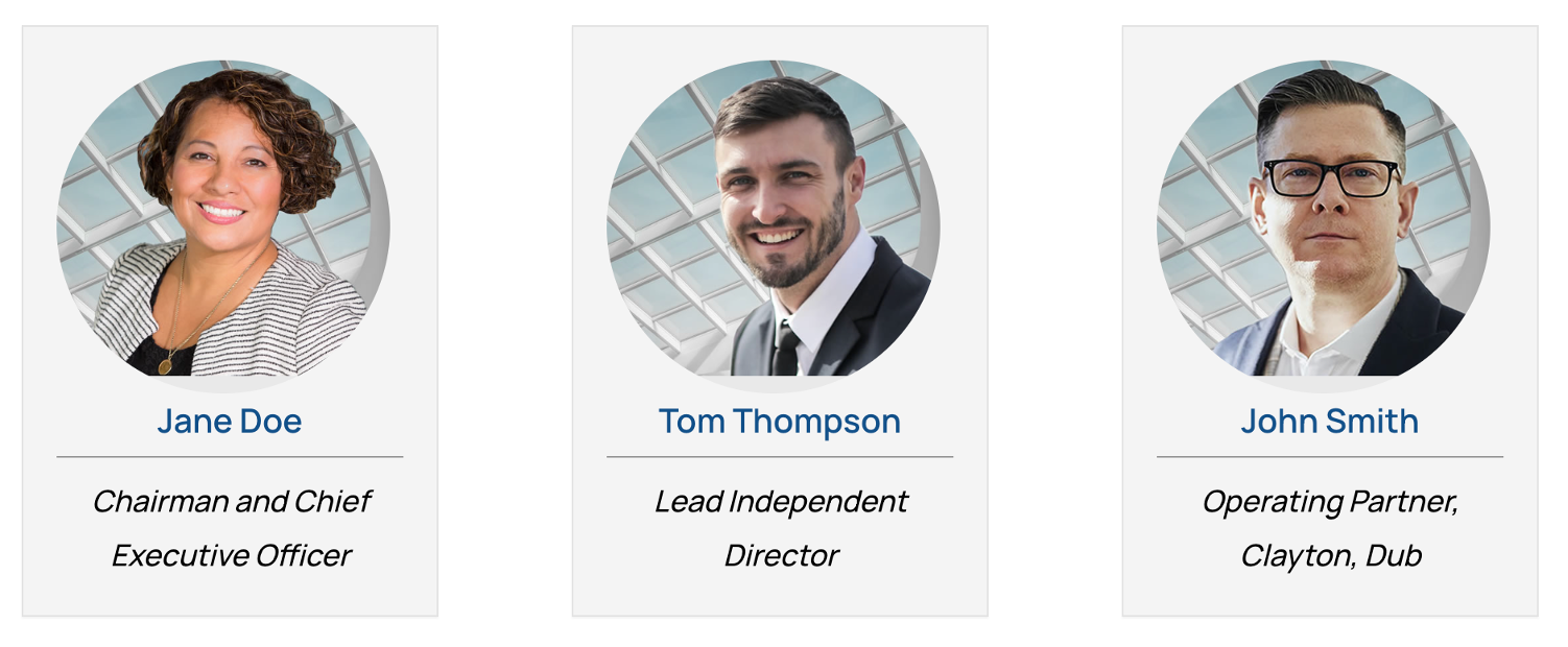 Provide the name, title, bio, and committee membership for each executive and board member. A professional photo of a board member enhances credibility, fosters trust, and adds a personal touch, showcasing the organization’s professionalism and leadership.